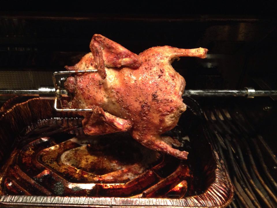 Finally, if you don’t have a BBQ, just put the bird in the oven on a rotisserie with a grill (a big square metal dish with a grid to put the bird on it to avoid cooking it in its own juices) at 325 degrees until the same internal temperature or about 3 hours.
