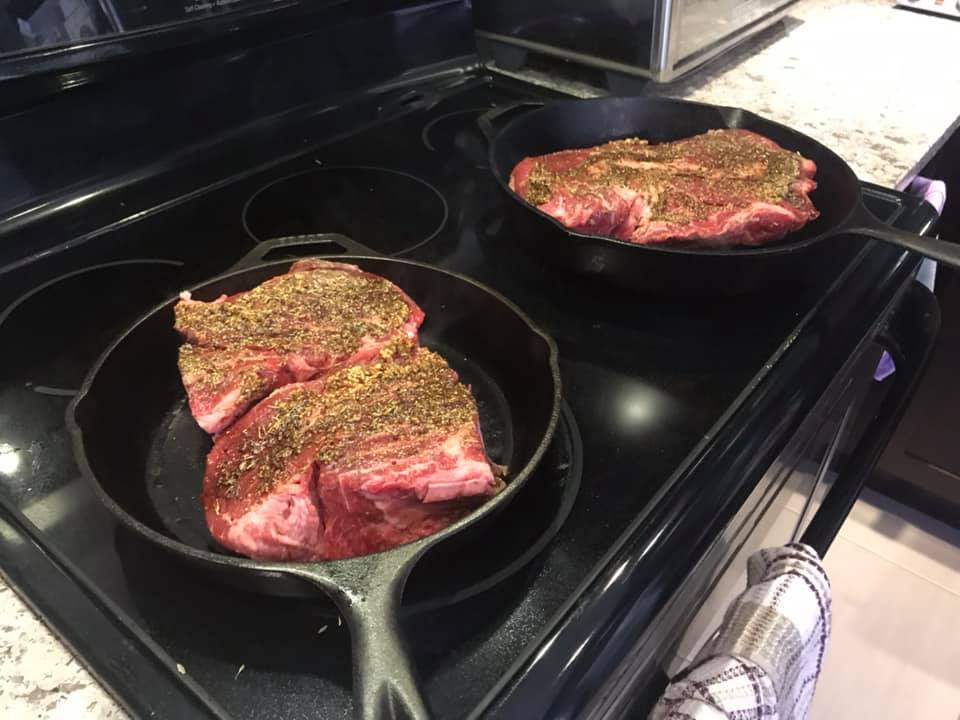 Grill in cast iron pan on each side. (10 min). Deglaze with remaining wine.