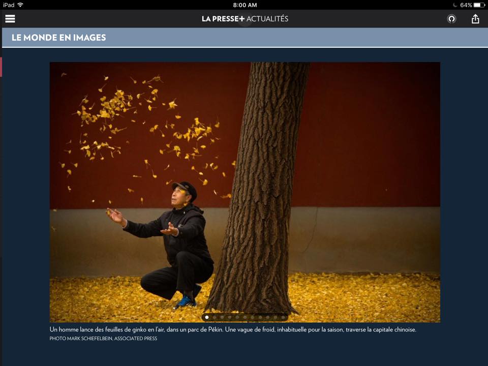 Quietly reading La Presse and sipping a coffee. I stumble upon something so beautiful and so touching that i cannot resist sharing. This photo is not just full of beauty, it is full of meaning. A man a certain age pick up dead leaves and throws them in the air… What is he doing? CreatingContinue reading “The falling leaves…”